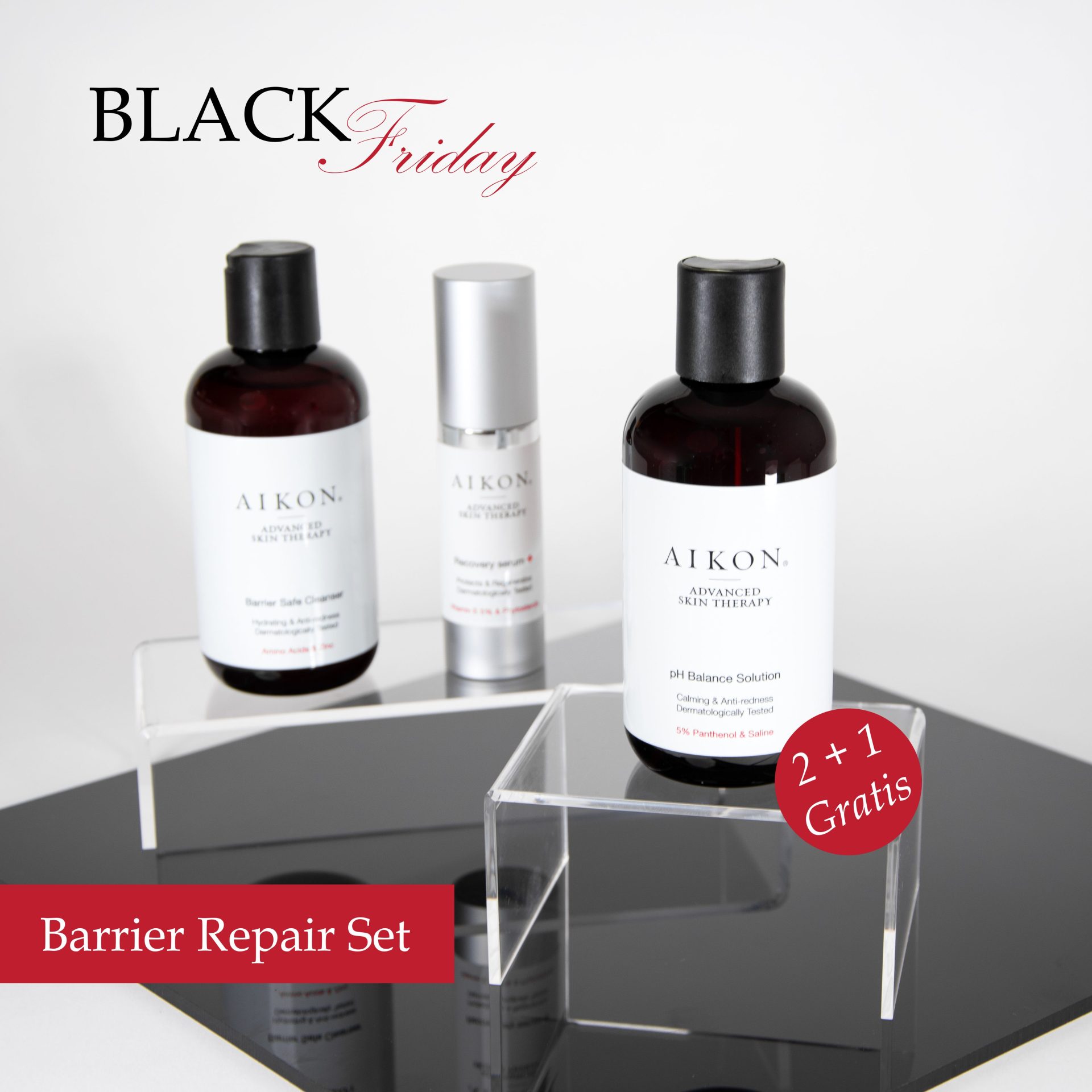 Paket Barrier Repair Set, premišljeno zasnovan kozmetični paket za Black Friday, ki je namenjen intenzivni obnovi in zaščiti bariere kože v hladnejših mesecih. Ta paket združuje Aikonov absolutni kultni hit – Recovery Serum Plus, sveže pečeni nagrajenec in ljubljenček žirije na Grazia Best of Beauty Awards 2023, formuliran z visoko koncentriranimi aktivnimi sestavinami za hitro in intenzivno obnovo bariere, ter blago in barieri prijazno čistilo Barrier Safe Cleanser, ki učinkovito odstranjuje nečistoče ob ohranjanju naravnega pH-ja kože. Kot ekskluzivno ponudbo dodajamo brezplačen pH Balance Solution, izotonično raztopino v vlogi tonika, obogateno z laktično kislino in pomirjujočimi sestavinami, ki aktivno pomaga krepijo bariero in vzdržuje zdravo ravnovesje mikrobioma kože.
